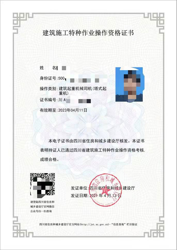 四川省住房和城鄉(xiāng)建設(shè)廳《特種作業(yè)操作證》: 建筑電工,建筑架子工,建筑架子工(附著升降腳手架,)建筑起重司索信號(hào)工,建筑起重司機(jī)(塔式起重機(jī)),建筑起重安裝拆卸工(塔式起重機(jī))建筑起重機(jī)械司機(jī)(施工升降機(jī)),建筑起重安裝拆卸工(施工升降機(jī)),建筑起重機(jī)械司機(jī)(物料提升機(jī)),建筑起重安裝拆卸工(物料提升機(jī)),高空作業(yè)吊籃安裝拆卸工,經(jīng)省級(jí)以上人民政府建設(shè)主管部門認(rèn)定的其他特種作業(yè)。 國(guó)務(wù)院建設(shè)主管部門負(fù)責(zé)全國(guó)建筑施工特種作業(yè)人員的監(jiān)督管理工作。 申請(qǐng)從事建筑施工特種作業(yè)的人員,應(yīng)當(dāng)具備下列基本條件: 1,年滿18周歲且符合相關(guān)工種規(guī)定的年齡要求,2, 初中及以上學(xué)歷,3, 符合相應(yīng)特種作業(yè)需要的其他條件。 建筑施工特種作業(yè)人員是指在房屋建筑和市政工程施工活動(dòng)中,從事可能對(duì)本人、他人及周圍設(shè)備設(shè)施的安全造成重大危害作業(yè)的人員。(兩年一復(fù)審到期前3個(gè)月復(fù)審); 建筑施工特種作業(yè)人員必須經(jīng)建設(shè)主管部門考核合格,取得建筑施工特種作業(yè)人員操作資格證書(以下簡(jiǎn)稱“資格證書”),方可上崗從事相應(yīng)作業(yè)。