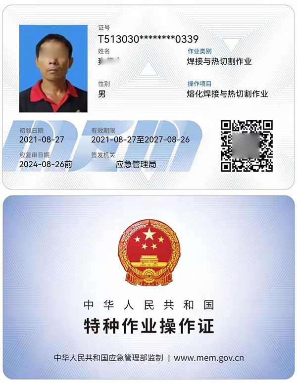 焊工證分為好幾種,上崗常用的屬于焊工特種作業(yè)操作證,是原安監(jiān)局(現(xiàn)在的應(yīng)急管理局)頒發(fā)的證件,證件全國通用、聯(lián)網(wǎng)可查,類似于身份證樣式的IC卡,有效期為6年,每3年需要復(fù)審一次,6年到期需要換證,復(fù)審和換證一般需要提前2-3個月申請,如果過期的話就視為作廢了,到時候就只能重新考!所以考了證的學(xué)員一定要記得提前復(fù)審和換證。