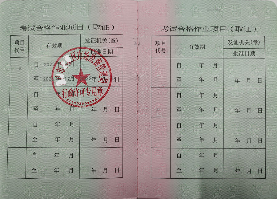 特種安全設(shè)備管理A,(電梯管理,鍋爐壓力容器管道管理,起重機(jī)械管理,場(chǎng)(廠(chǎng))內(nèi)專(zhuān)用機(jī)動(dòng)車(chē)輛管理,)起重機(jī)指揮Q1,起重司機(jī)(限門(mén)座式起重機(jī))Q2,起重司機(jī)(限橋式起重機(jī))Q2,起重司機(jī)(限門(mén)式起重機(jī))Q2,起重司機(jī)(限纜索式起重機(jī))Q2,起重司機(jī)(限塔式起重機(jī))Q2,起重司機(jī)(限流動(dòng)式起重機(jī))Q2,起重司機(jī)(限升降機(jī))Q2,叉車(chē)司機(jī)N1,觀光和觀光列出司機(jī)N2,電梯維修T,鍋爐壓力容器壓力管道管理,電梯管理,起重機(jī)械管理,場(chǎng)(廠(chǎng))內(nèi)專(zhuān)用機(jī)動(dòng)車(chē)輛管理,工業(yè)鍋爐司爐,電站鍋爐司爐,鍋爐水處理,快開(kāi)門(mén)式壓力容器操作,移動(dòng)式壓力容器充裝,氣瓶充裝,金屬焊接操作(壓力焊PE焊),非金屬焊接操作(壓力容器焊),食品檢驗(yàn)員,化學(xué)檢驗(yàn)員,農(nóng)產(chǎn)品檢驗(yàn)員(4年一審,需要到期前3個(gè)月進(jìn)行)