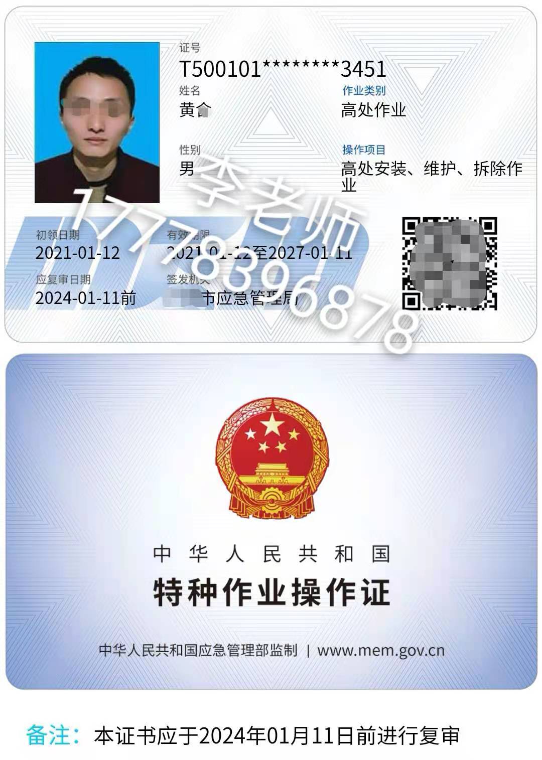高處安裝,維護,拆除作業作業操作證:是由應急管理廳(原安監局)頒發,是從事登高架設作業或高處安裝、維護、拆除作業工作的人員必須考取的特種作業操作證。該證是安監局頒發的。登高架設作業證:專用設備進行建筑物內外裝飾、清潔、裝修,電力、電信等線路架設,高處管道架設,小型空調高處安裝、維修,各種設備設施與戶外廣告設施的安裝、檢修、維護以及在高處從事建筑物、設備設施拆除作業的工作。 以下都屬于高處作業,都需要考取高處作業操作證:指專門或經常在墜落高度基準面2米及以上有可能墜落的高處進行的作業。指在高處從事腳手架、跨越架架設或拆除的作業。高處安裝、維護、拆除作業。指在高處從事安裝、維護、拆除的作業。適用于利用專用設備進行建筑物內外裝飾、清潔、裝修,電力、電信等線路架設,高處管道架設,小型空調高處安裝、維修,各種設備設施與戶外廣告設施的安裝、檢修、維護以及在高處從事建筑物、設備設施拆除作業。